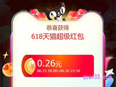 1、淘宝618红包领取地址:https://l.quan05.com/item/235.html
