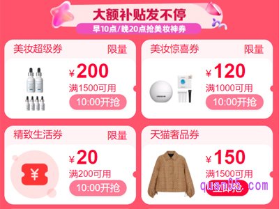 1、天猫618大牌美妆会场:https://l.quan05.com/item/419.html 。