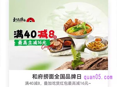 饿了么的促销活动,开展了“和府捞面全国品牌日”,我们可以领券满40减8元。具体的活动如下: 1、活动主题:饿了么和府捞面全国品牌日 2、活动时间:2024-09-04 至 2024-09-05 3、活动主要内容: 饿了么和府捞面全国品牌日,领满40减8元优惠券,叠加吃货红包最高减16元 4、活动地址:点此直达》》。(自动呼起饿了么APP) 5、和府捞面全国品牌日微信二维码。