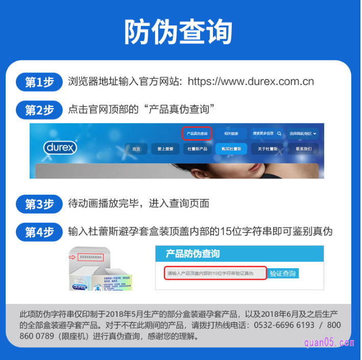 3、我们在网上购买杜蕾斯和实体店购买杜蕾斯是没有什么区别。要是卖家卖的是假货,你买了肯定是假货了。不过不用担心,杜蕾斯产品的包装盒子上都有防伪查询。我们进入杜蕾斯官方网站,点击导航栏的“产品真伪查询”,输入杜蕾斯避孕套盒装顶盖内部的15位字符串就能查出来真假。如下图。
