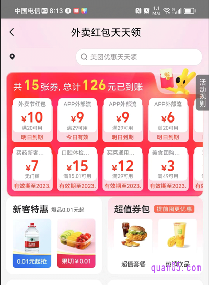 1、美团周三外卖节红包在美团外卖红包天天领活动页面领取。美团外卖红包天天领活动地址:https://l.quan05.com/item/20.html。