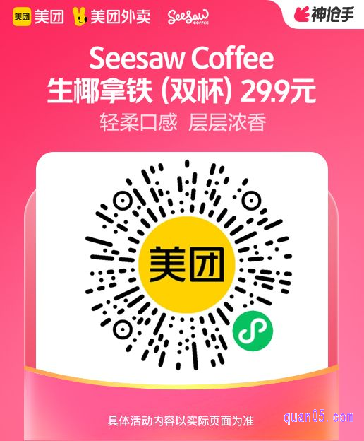 1、活动内容:Seesaw Coffee 生椰拿铁(双杯),轻柔口感,层层浓香,现在市场价66元,现在活动价29.9元