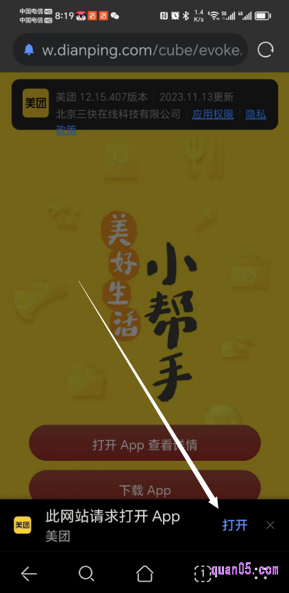 3、在唤起美团APP的中间页,如下图,点击【打开】,就能唤起美团APP,进入美团外卖优惠券活动页。
