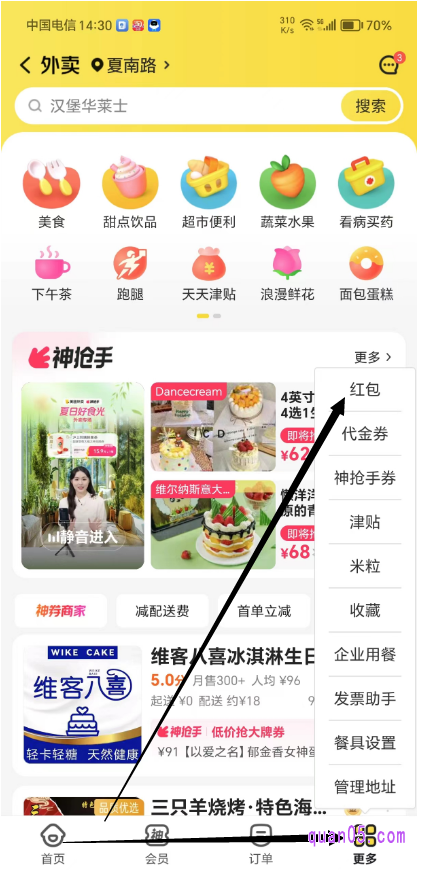 2、美团外卖频道首页,如下图,点击页面底部栏右下角的【更多】按钮,再在弹窗中点击【红包】按钮,进入美团外卖“美团红包”页面。