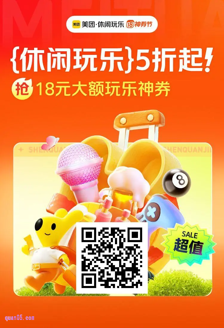美团的休闲玩乐频道在2024年10月15日至18日,开展了休闲玩乐5折起的促销活动,我们可以领取18元休闲玩乐神券。具体的活动详情如下: