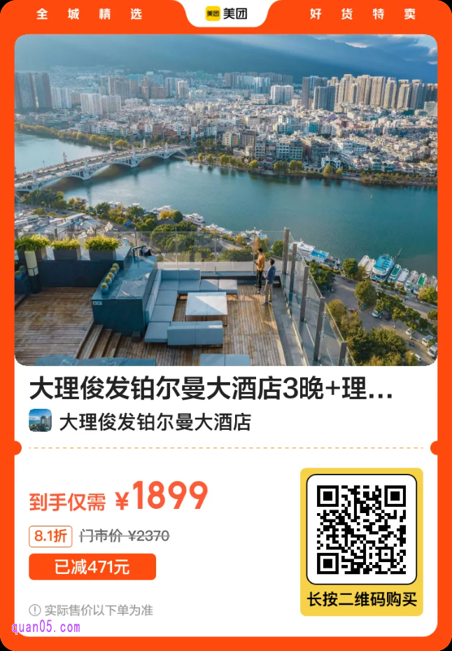 美团酒店平台开展“大理俊发铂尔曼大酒店”的促销活动,3晚套餐1899元。具体的活动详情如下:
