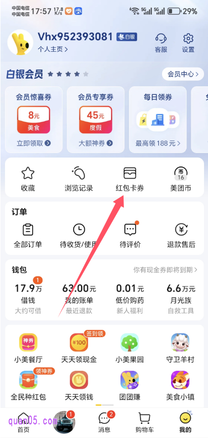 2、美团APP“我的”页面,点击【红包卡券】按钮,进入美团“我的券”列表页面。