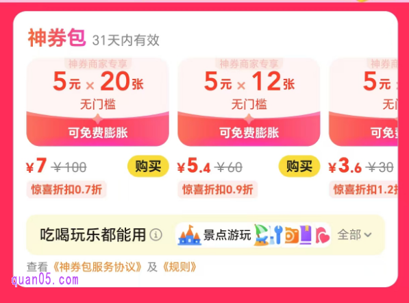 1、从美团神券包的价格来看:3.6元买6张5元无门槛券。5.4元买12张5元无门槛券,7元买100元神券包。价格是非常的便宜实惠,我们只需从美团上完成一个订单就可以回本。