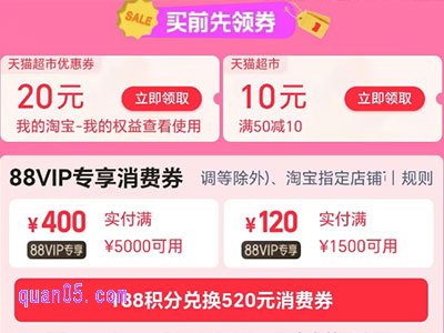 2024年的淘宝双11第二波活动在10月25日就开始,88会会员也都开始关注消费券的领取了。那么,2024年淘宝双11第二波88vip消费券是多少,怎么领?下面券零五就给大家介绍下,赶紧一起来看看吧。