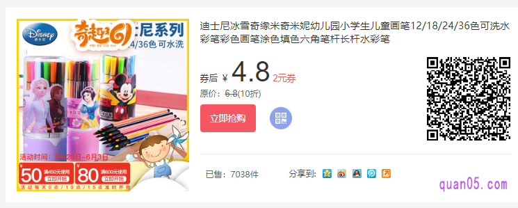 迪士尼冰雪奇缘米奇米妮儿童水彩笔12色一盒原价6.8元,有2元优惠券,券后价格是4.8元。18色儿童水彩笔原价是11.8元,券后价格是9.8元。24色水彩笔一盒原价14.8元,券后价格是12.8元。